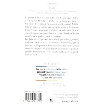 Édition présentée et commentée par Annie Collognat-Barès (lycée Victor-Hugo) et Odile Mortier-Waldschmidt (université d'Amiens). La guerre de Troie s'éternise. Pâris le Troyen a ravi Hélène à son époux Ménélas et les Grecs s'acharnent à venger l'honneur de ce dernier. En abandonnant le combat, Achille, furieux après le rapt de sa captive bien-aimée Briséis par le roi Priam, compromet la victoire de son camp. Rien ne saurait apaiser sa colère, hormis la mort héroïque de son ami Patrocle qui le ramène à la raison... Les hommes s'épuisent en vaines querelles, guerres, trahisons et massacres. Les dieux et les déesses, qui en font autant, disposent de leurs destinées. Huit siècles avant notre ère, un poète de génie légendaire nommé Homère, le premier magicien du verbe, chante la chanson épique de leurs exploits.Lire avec le texte intégral et la préfaceComprendre avec Les clés de l'œuvre 41 pages pour aller à l'essentiel 71 pages pour approfondir